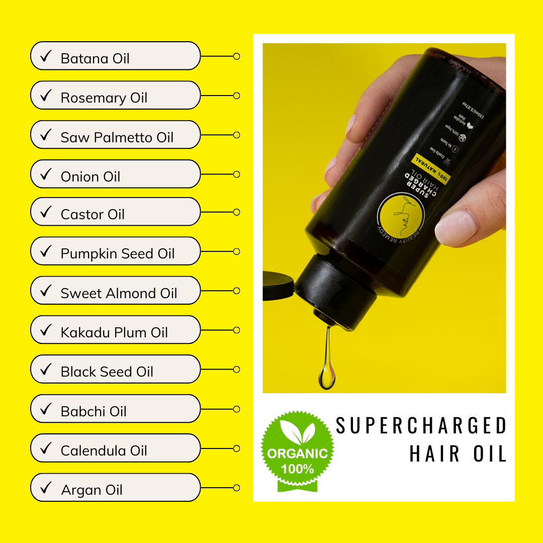 A: Unlike many single-ingredient oils, our Supercharged Hair Oil combines 14 powerful natural and organic oils carefully selected to address multiple hair concerns—hair fall, thinning, dryness, and damage. Ingredients like Batana Oil, Rosemary Oil, Pumpkin Seed Oil, and Saw Palmetto work together to strengthen roots, stimulate growth, and nourish your scalp. Most of our customers notice visible improvements in hair health and thickness within weeks of consistent use.